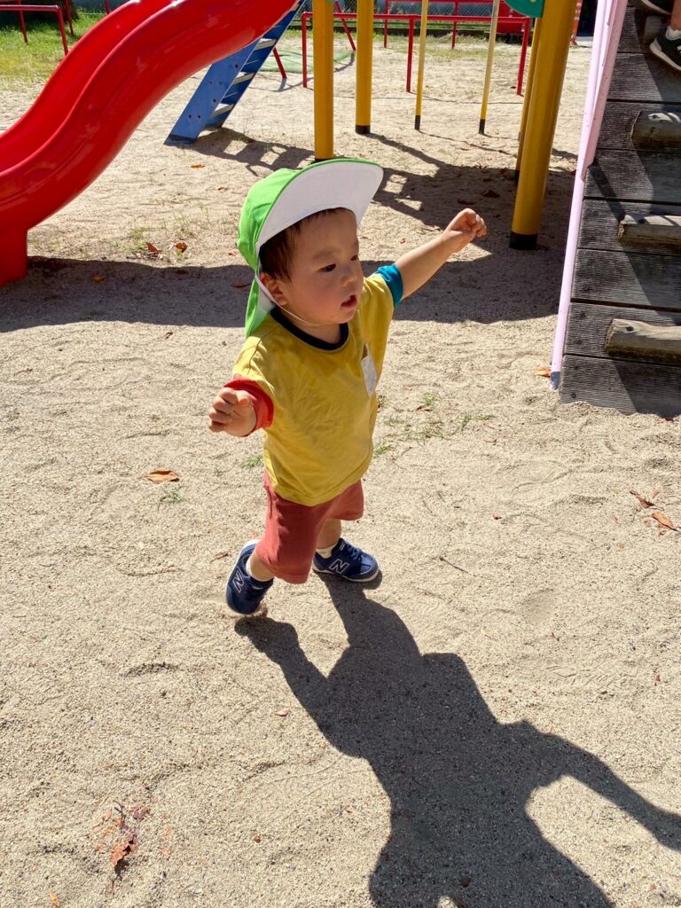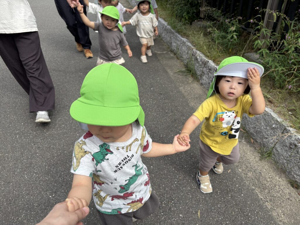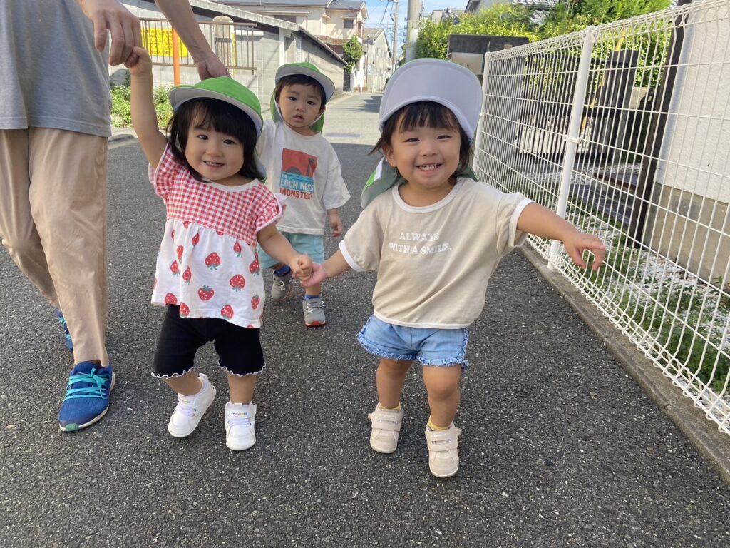 夏前の散歩では乳母車に乗っていた子も、お友達と手を繋いで歩けるようになりましたよ。公園に着くと「わぁ〜!」ととっても嬉しそうな子どもたち、歩くことを楽しんでいます♪