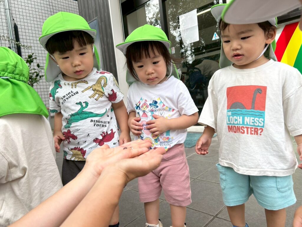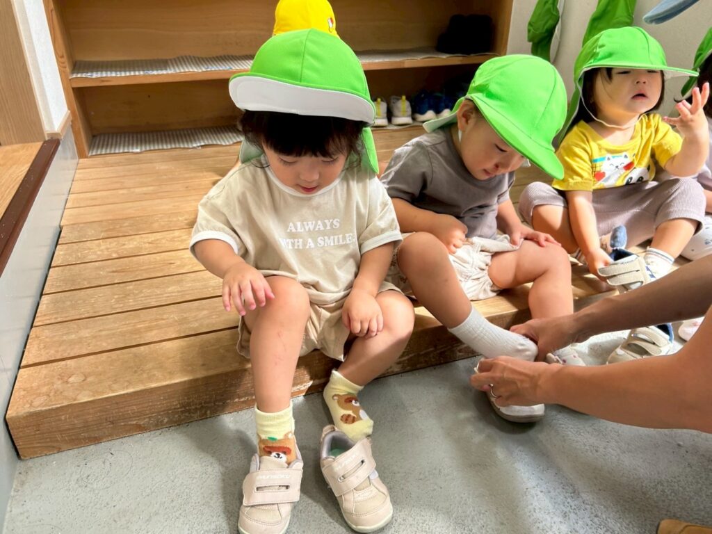 「散歩行くよ〜」と伝えると、目を輝かせて玄関に向かう子どもたち。帽子を被って、靴を取って、靴下と靴を履くという流れを伝えると自分たちでしようと頑張っています。自分で履けるようになってきたお友達もいて、日々の成長を感じています。ぜひお家でも、自分でできるように脱ぎ履きの仕方を伝えていってあげてくださいね♪