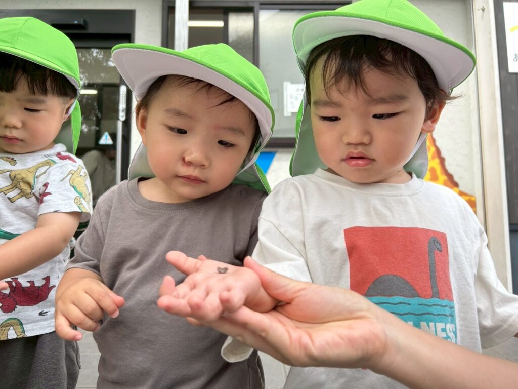 最後はまたお友達と手を繋いで保育園へ向かいます。保育園へ着くと、園前でだんご虫探しです。手のひらに乗せてあげると興味津々でだんご虫の動きを観察したり、手のひらがくすぐったくなって手を振り解いたりと反応は様々ですよ!