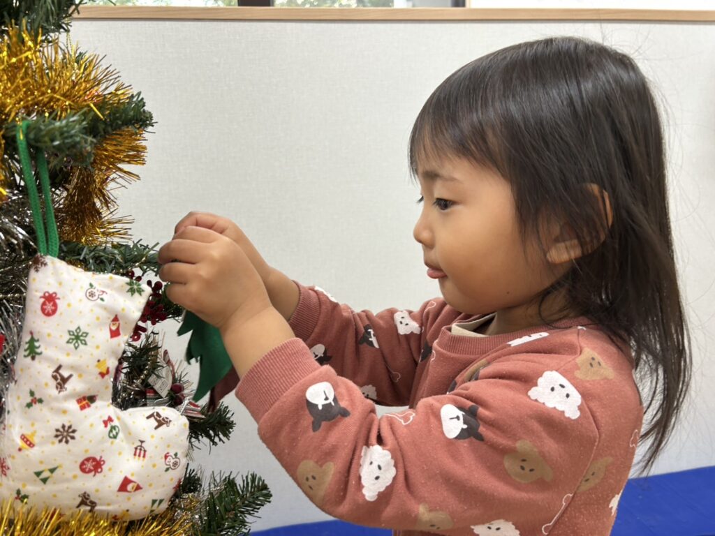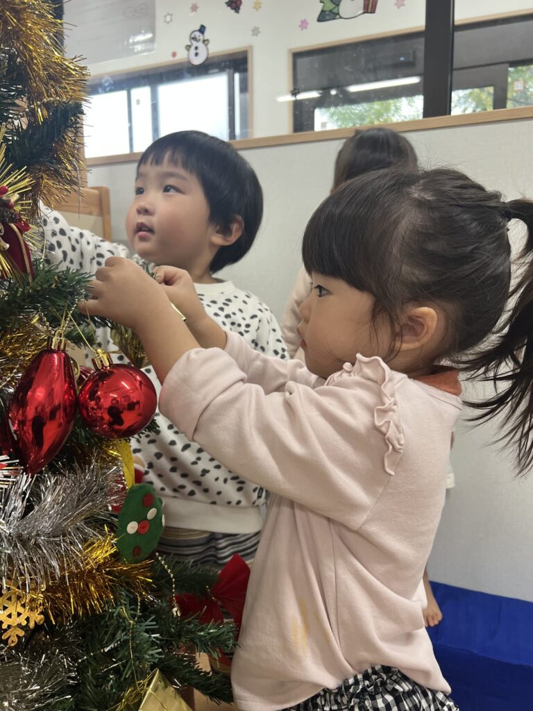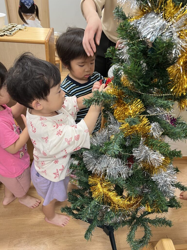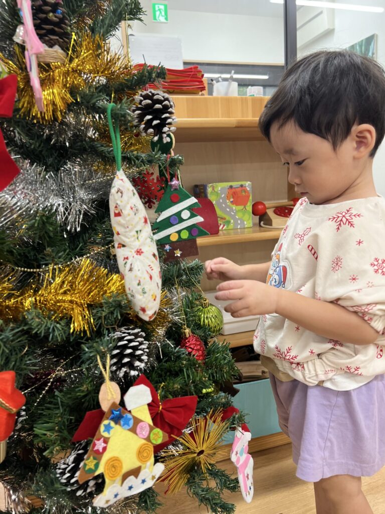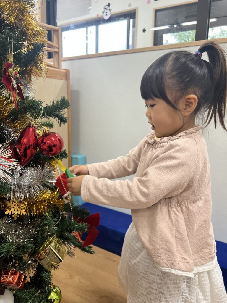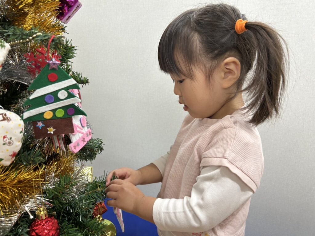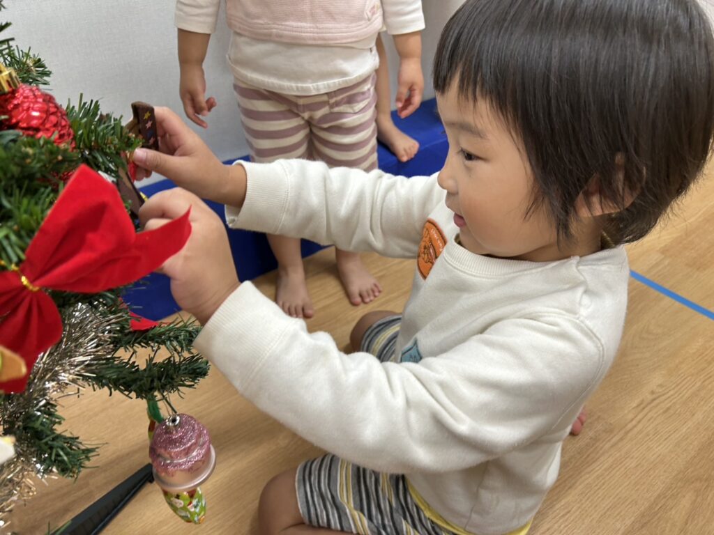 色々な種類のオーナメントを眺めて「これがいい!」と一人ひとつずつ選び、そーっとツリーに掛けて飾り付けを楽しみましたよ♩