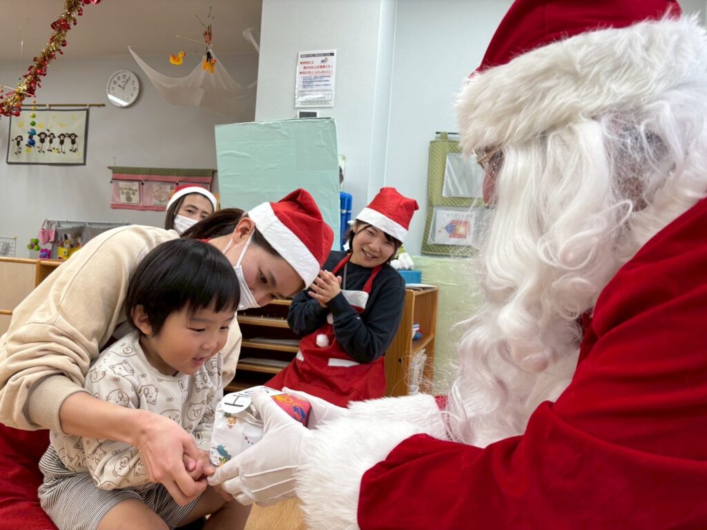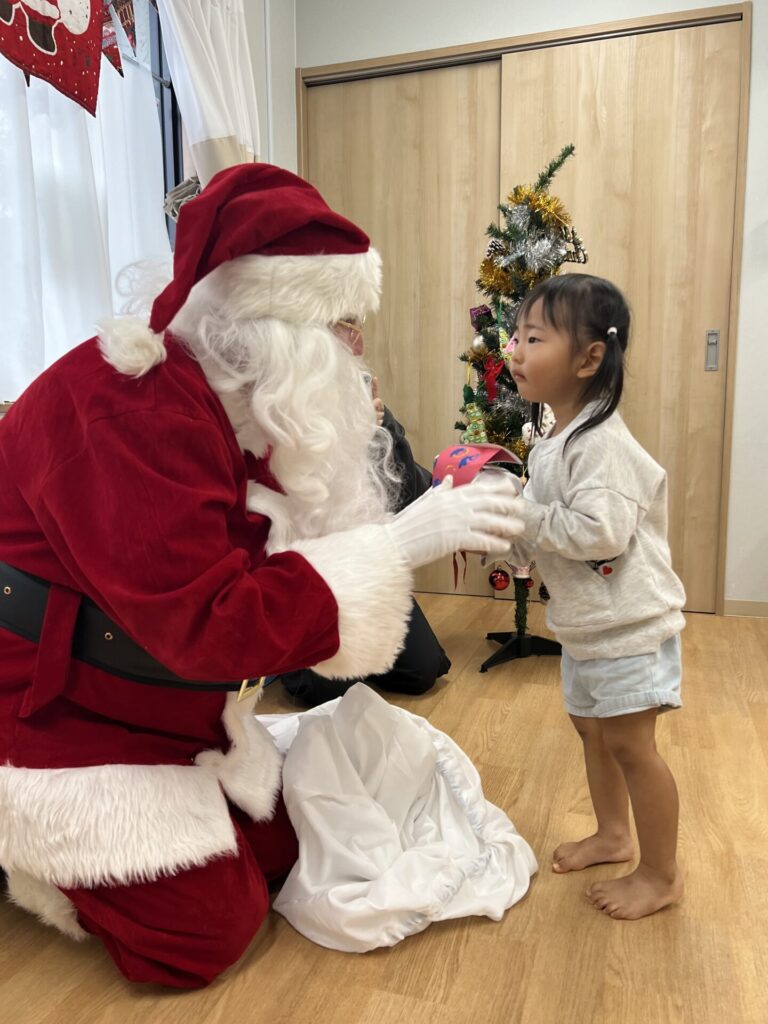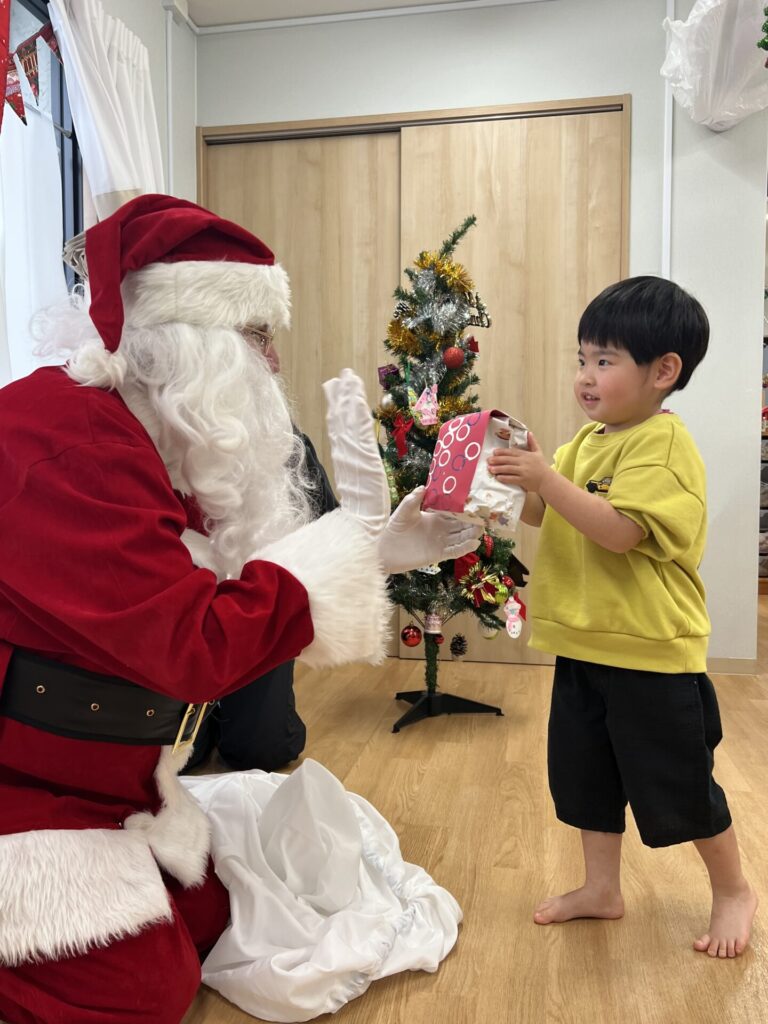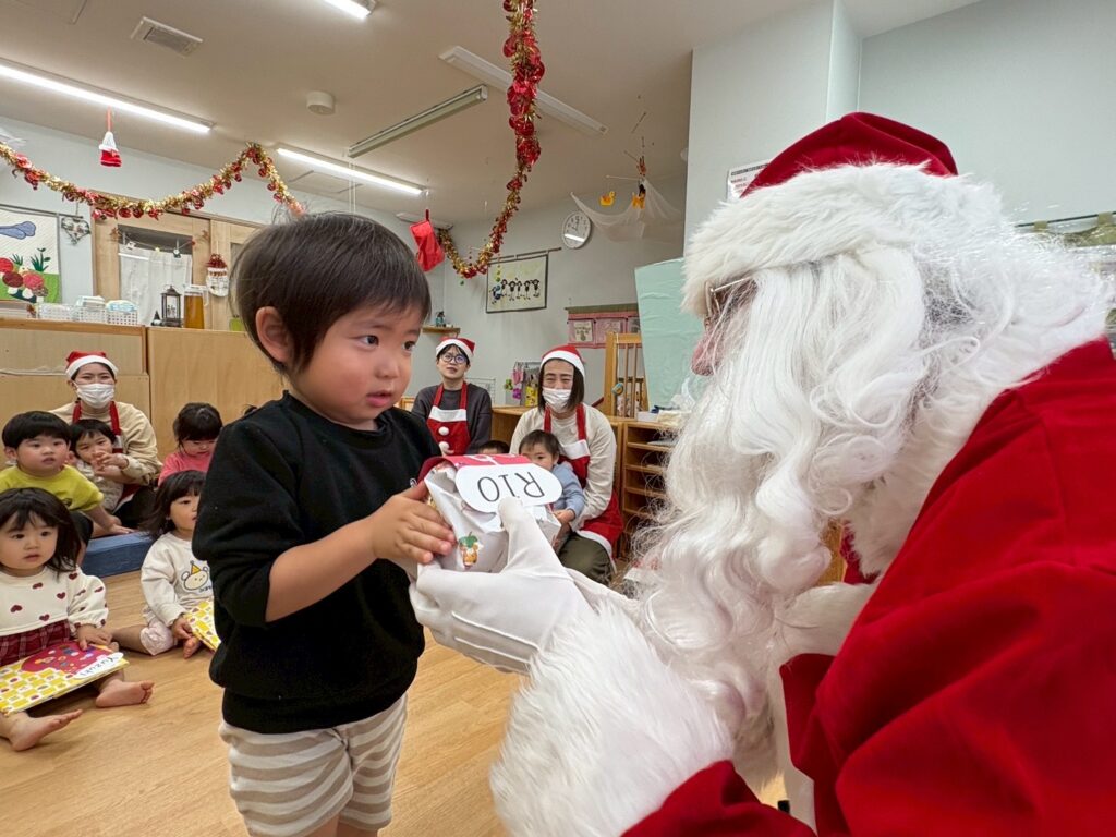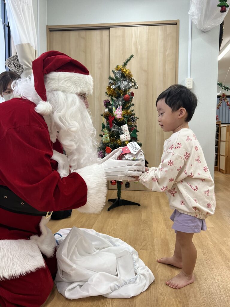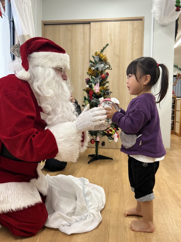 ちょっと緊張気味な表情で受け取ったり、「なにがはいっているのかなぁ?」とウキウキしたり、サンタさんとタッチをして喜んだり、、、と様々なリアクションをとる子どもたちでした!