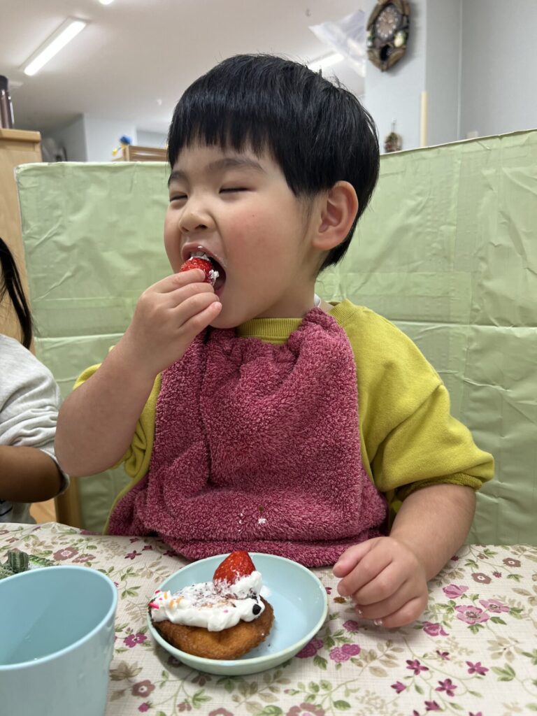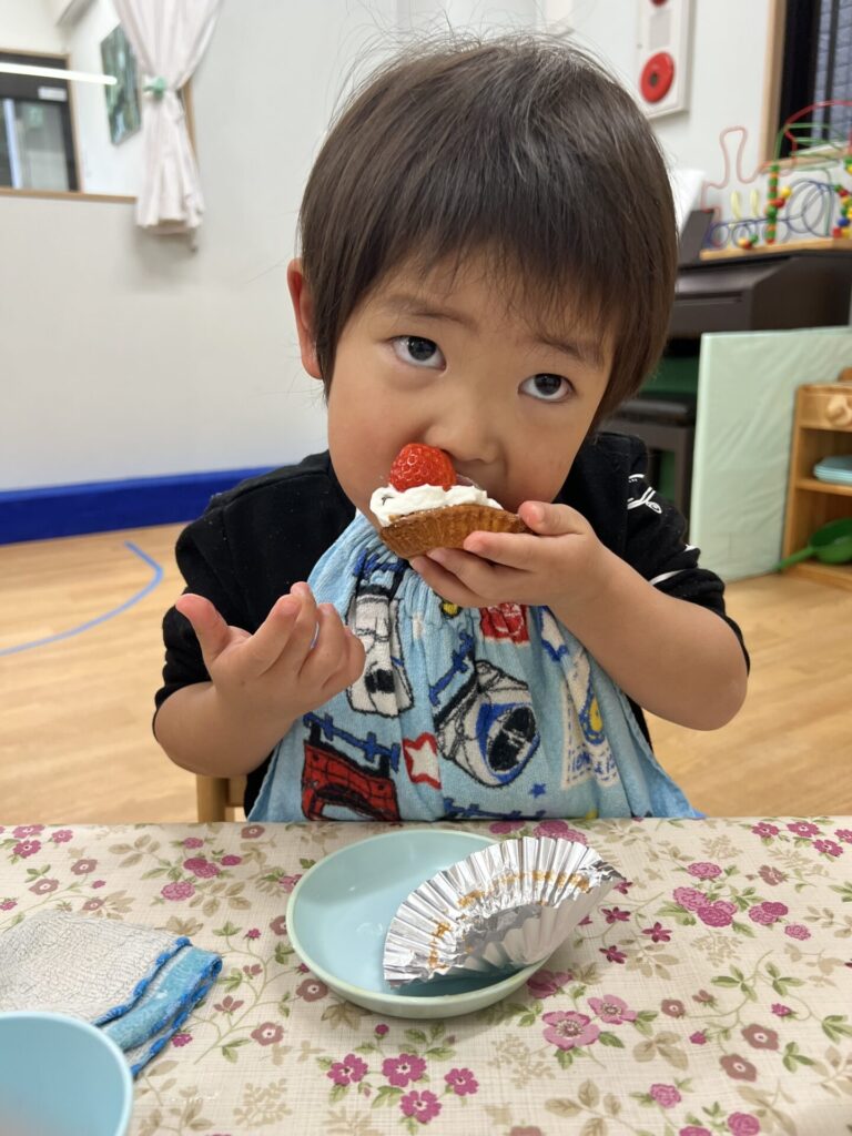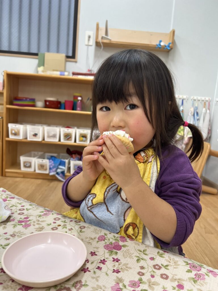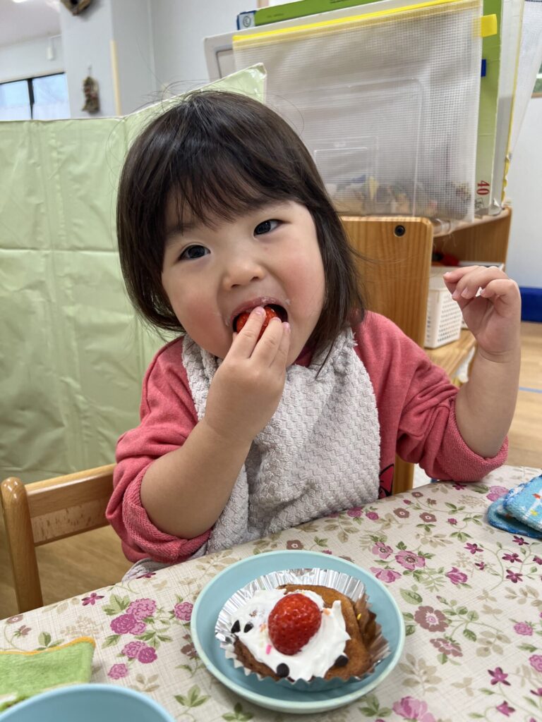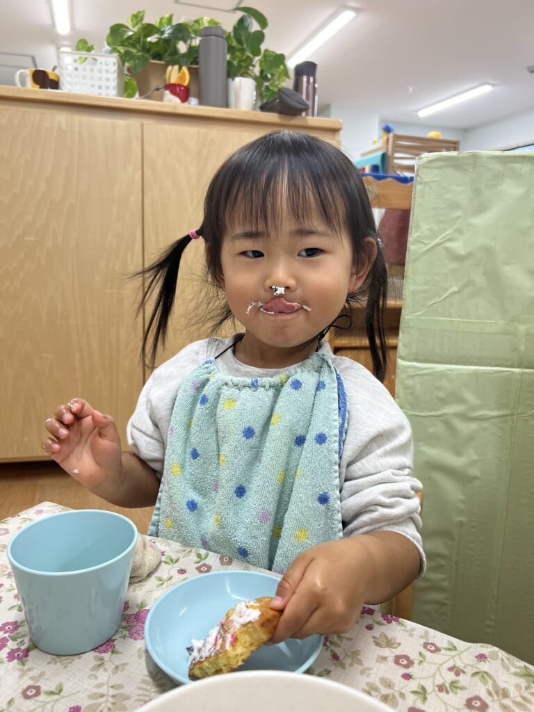 おやつのクリスマスマフィンも「けーきみたい♩」「おいしい!」と喜んで食べていましたよ!(^^)